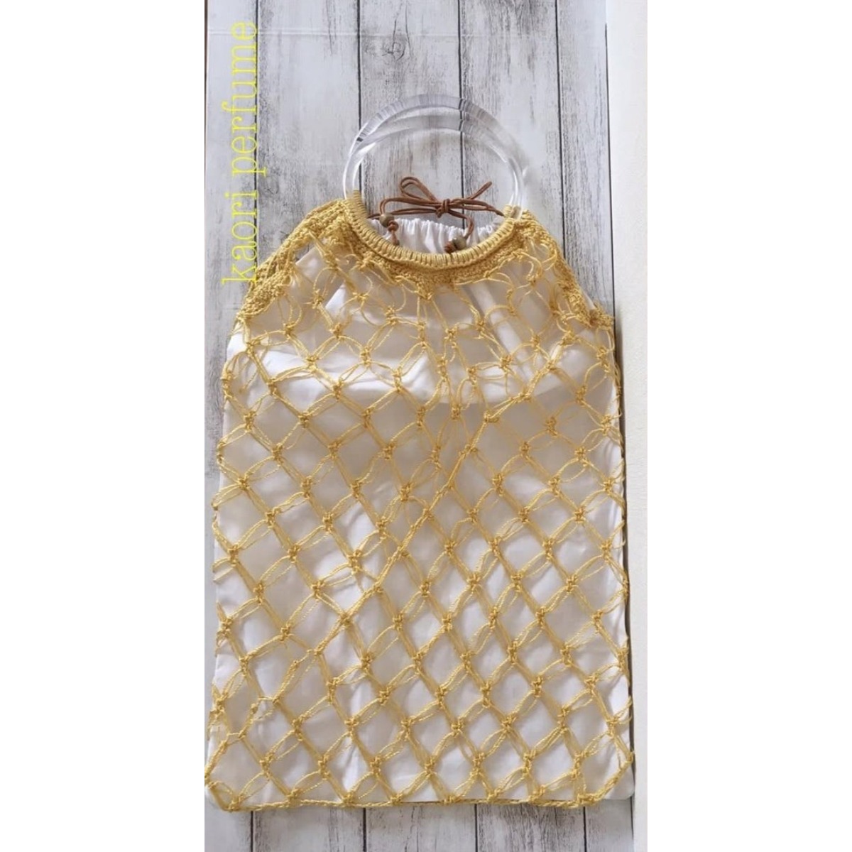 平巻きビニール紐とアクリル毛糸を引き揃えた円底バッグ。