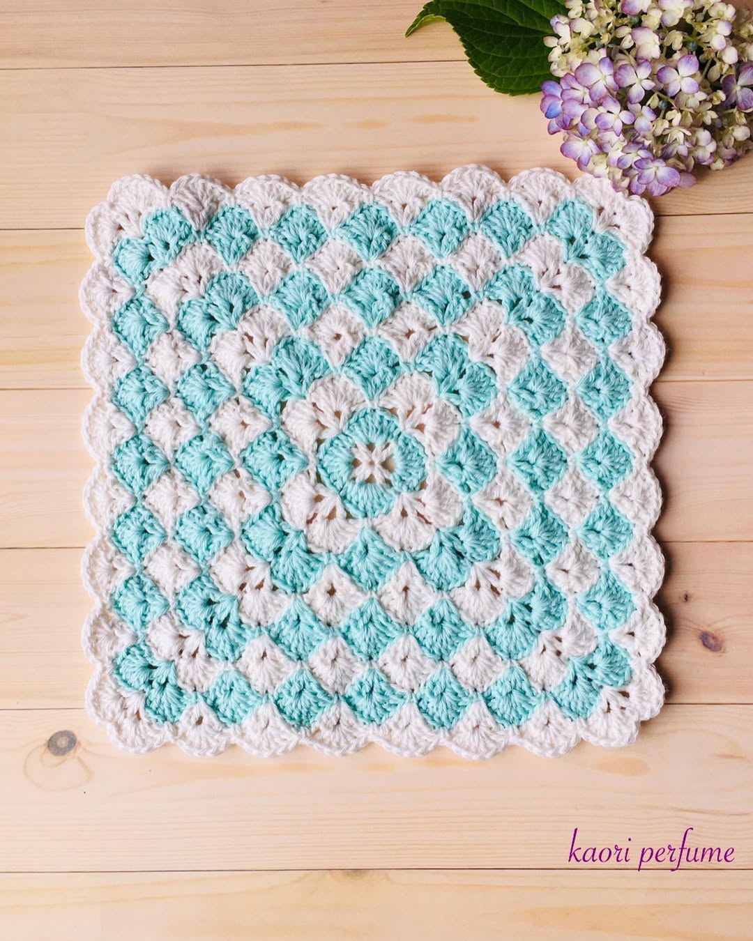 ブルーグリーンのコットン糸で編みました。