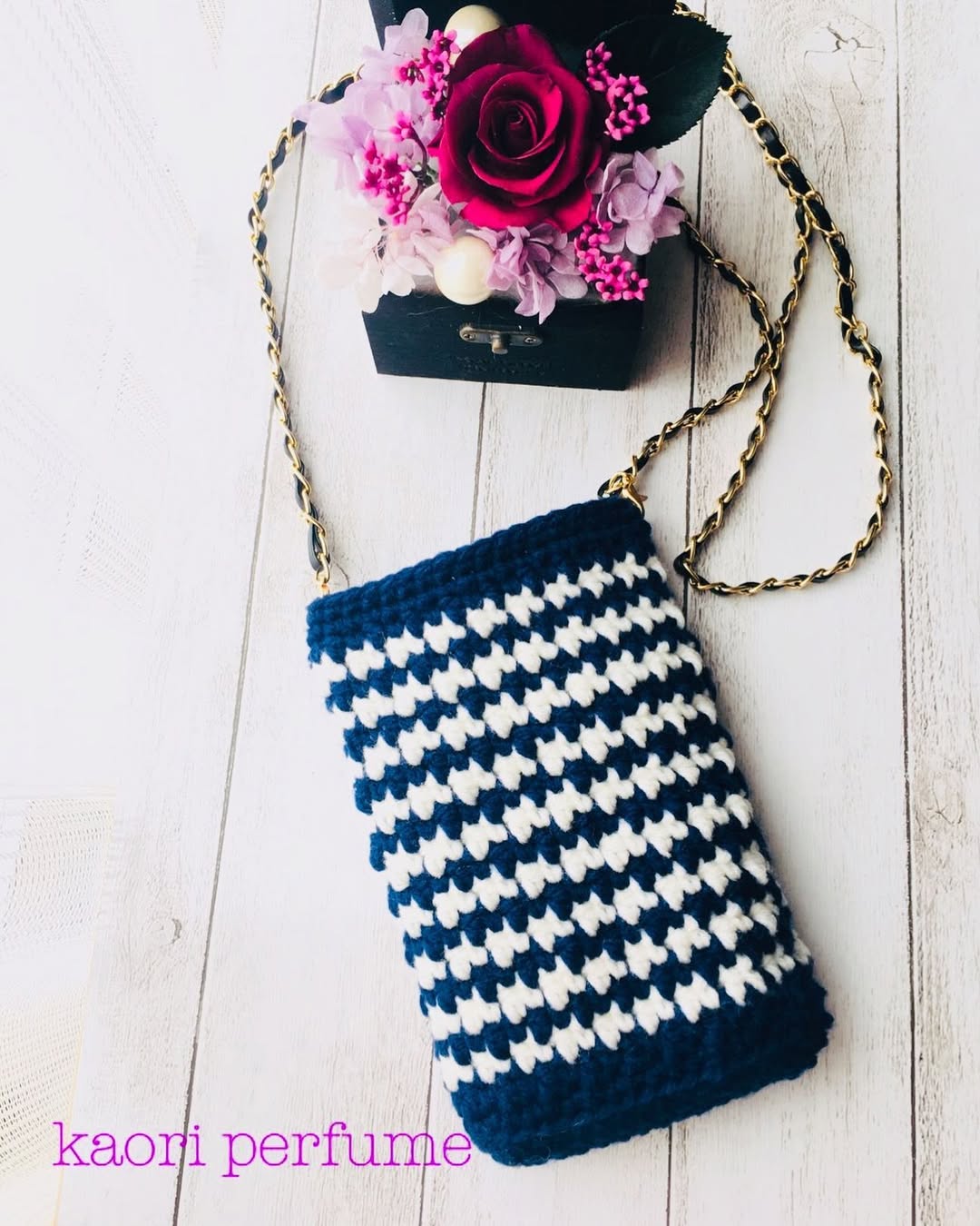 千鳥格子柄でポシェットを編みました。