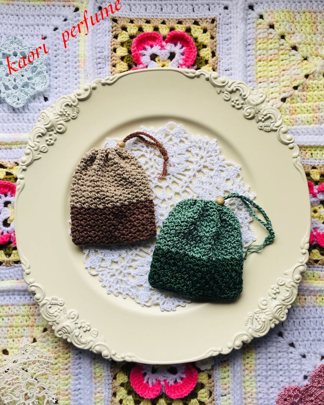 グリーン系はレース糸2本どりで編みました。