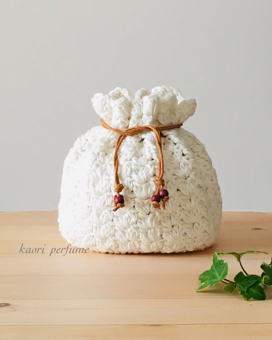 ブラウン系の巾着はコットン糸、
