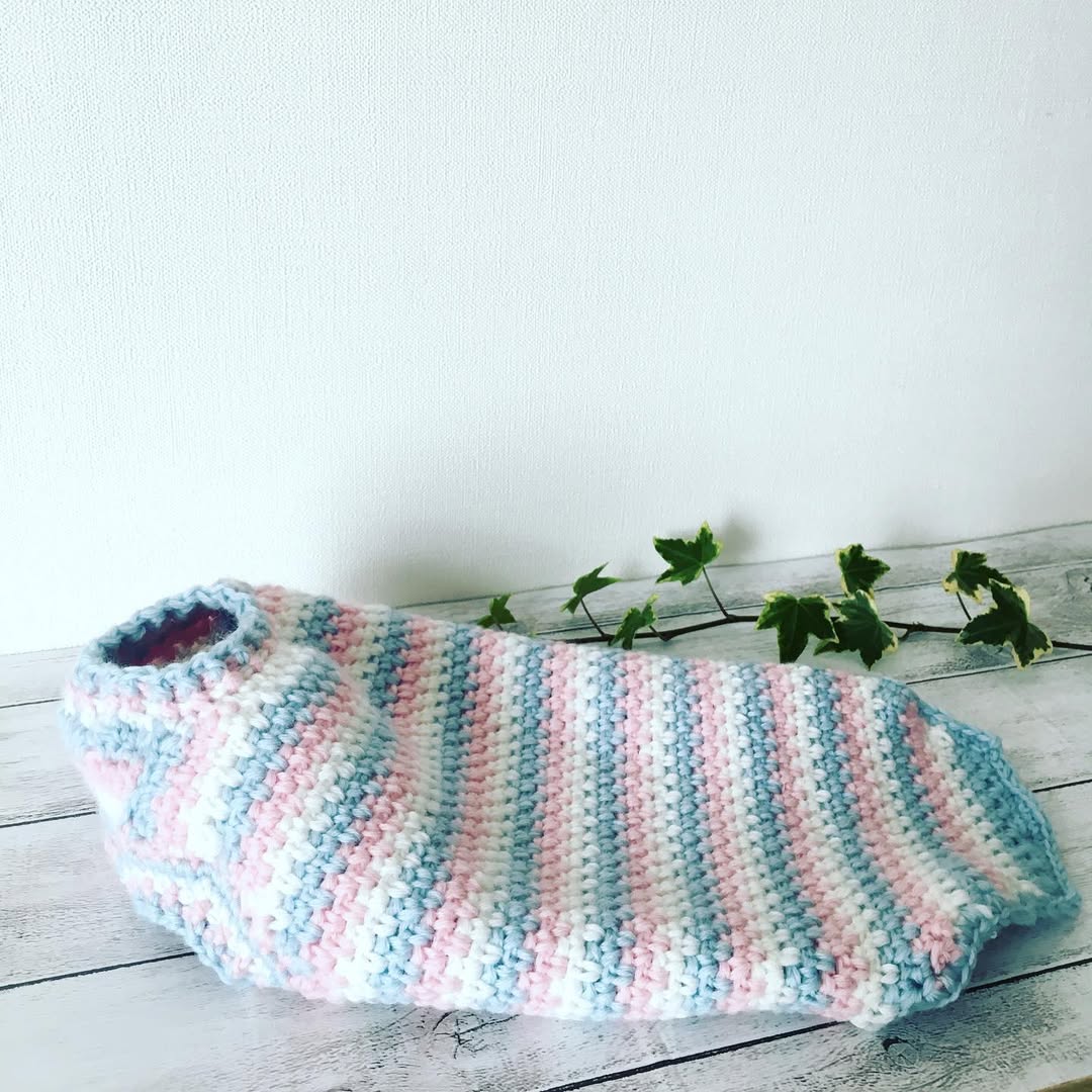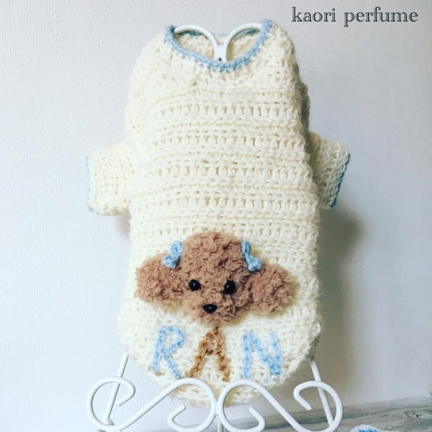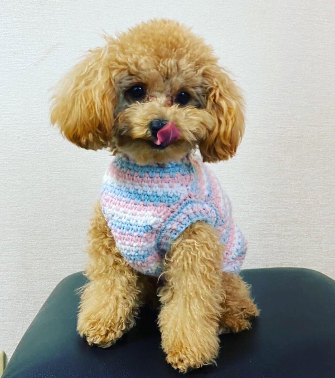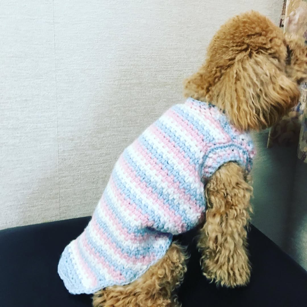 初めて編んだわんこ服、着てくれて大満足です🥰